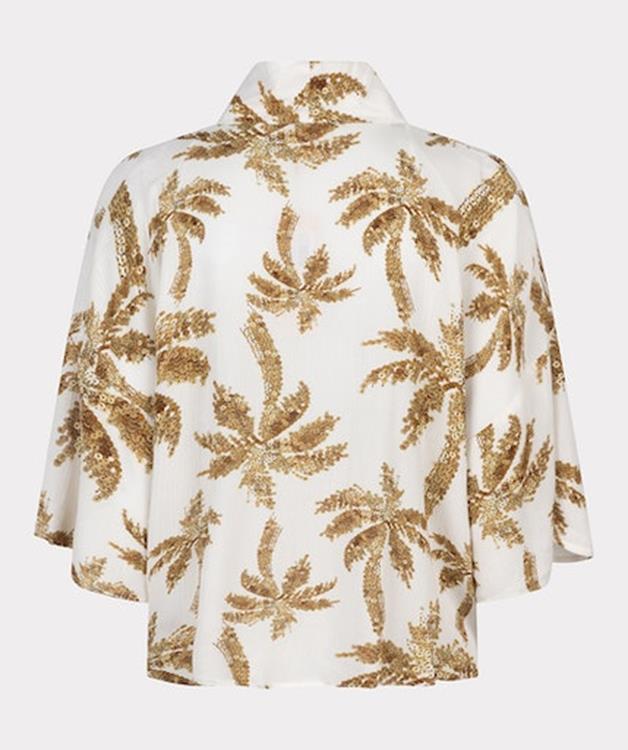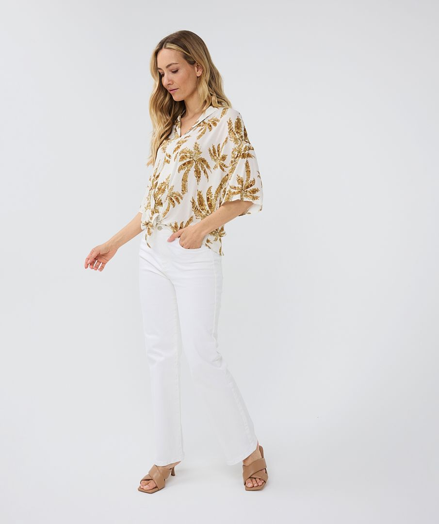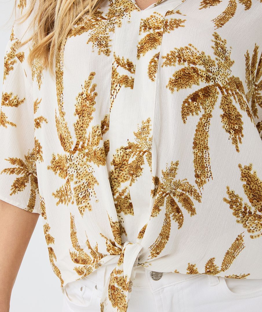 Prix régulier $42.00 CADChemisier large avec imprimé palmiers paradisiaques. La boutique est haute et cour avec le bouton sur le côté. Un modèle à la nageoire fluide, qui est également agréable à porter avec un maillot de bain ou un bikini.