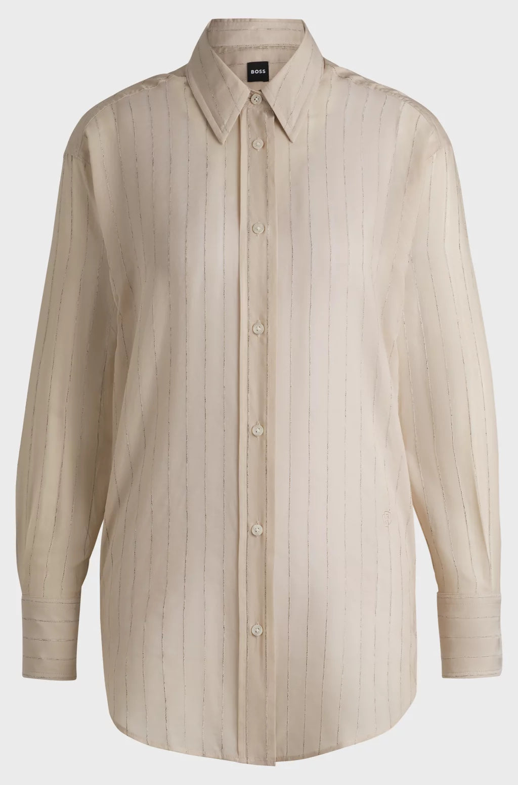 Prix régulier $174.00 CADExtensible pour une liberté de mouvement optimale, ce chemisier BOSS Femme est orné d'un motif à rayures brisées original. Coupe Regular Fit décontractée.