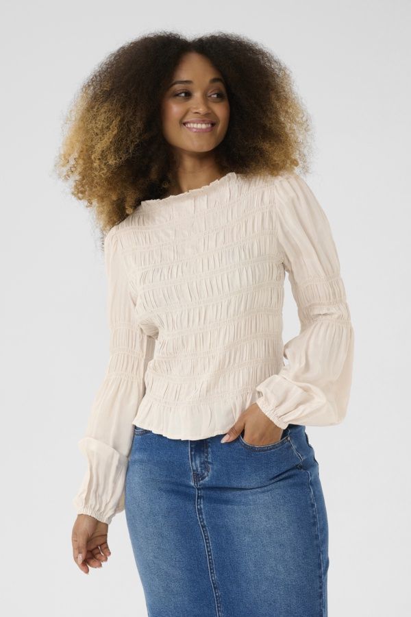 Chemisier smocké pour femme, coupe décontractée, manches longues et large encolure. Conçu pour le confort, il présente des fronces et une longueur légèrement raccourcie. Polyvalent, il se porte aussi bien au bureau qu'au quotidien.