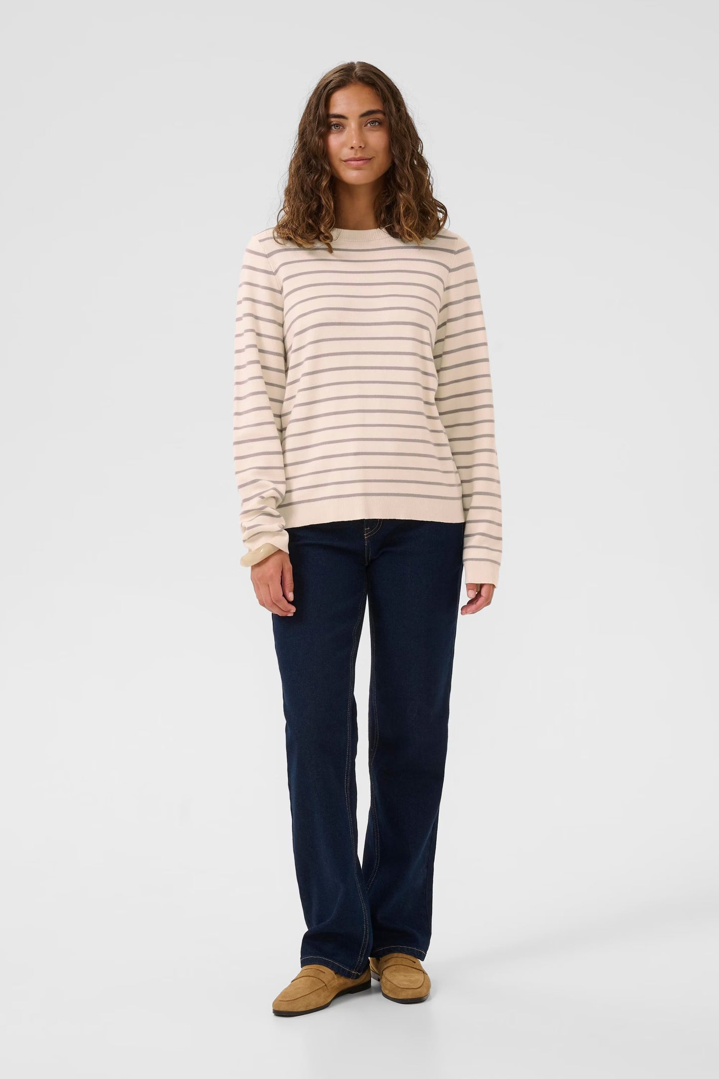 Ce pull rayé pour femme présente une coupe décontractée, une encolure ronde et des manches longues. Il offre un style polyvalent et un confort quotidien, que ce soit pour le travail ou les sorties décontractées. Sa silhouette classique le rend idéal à superposer.