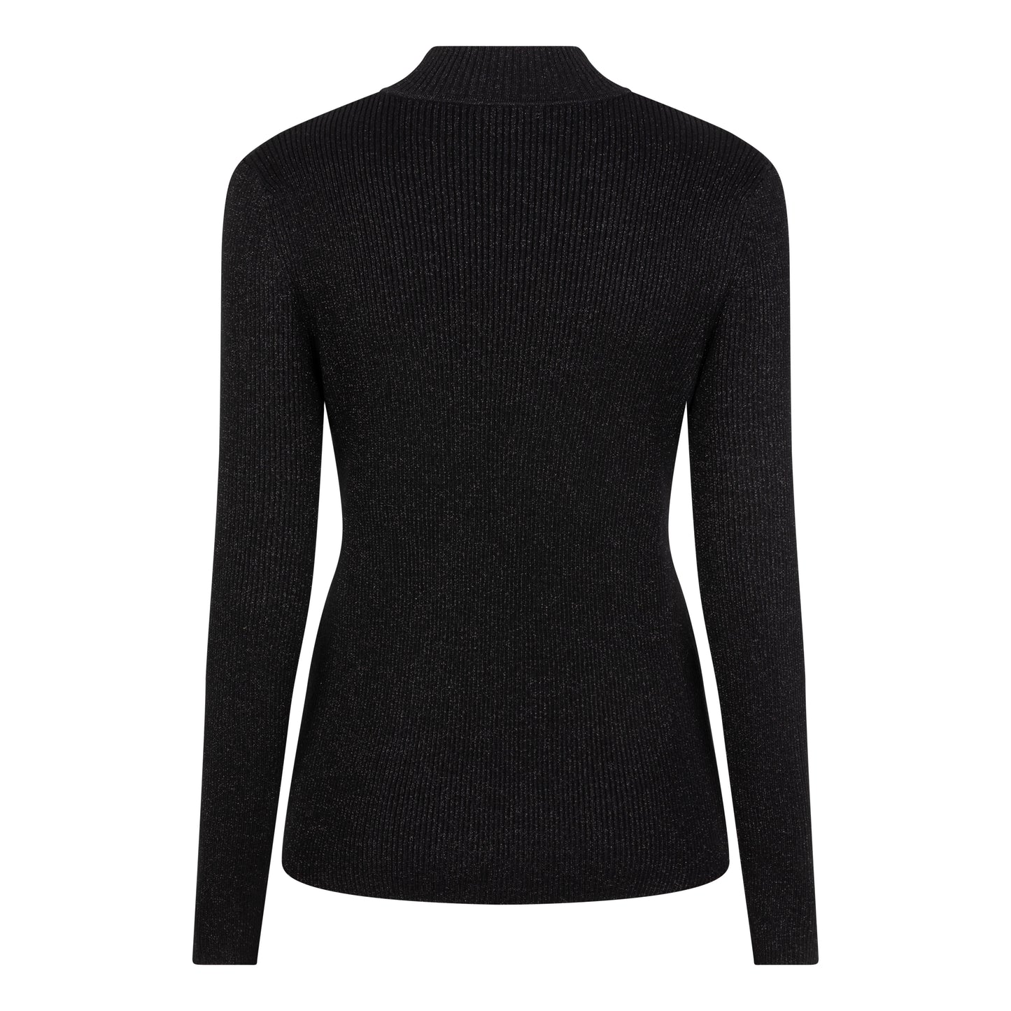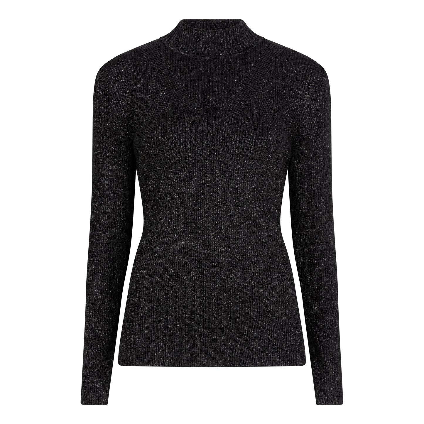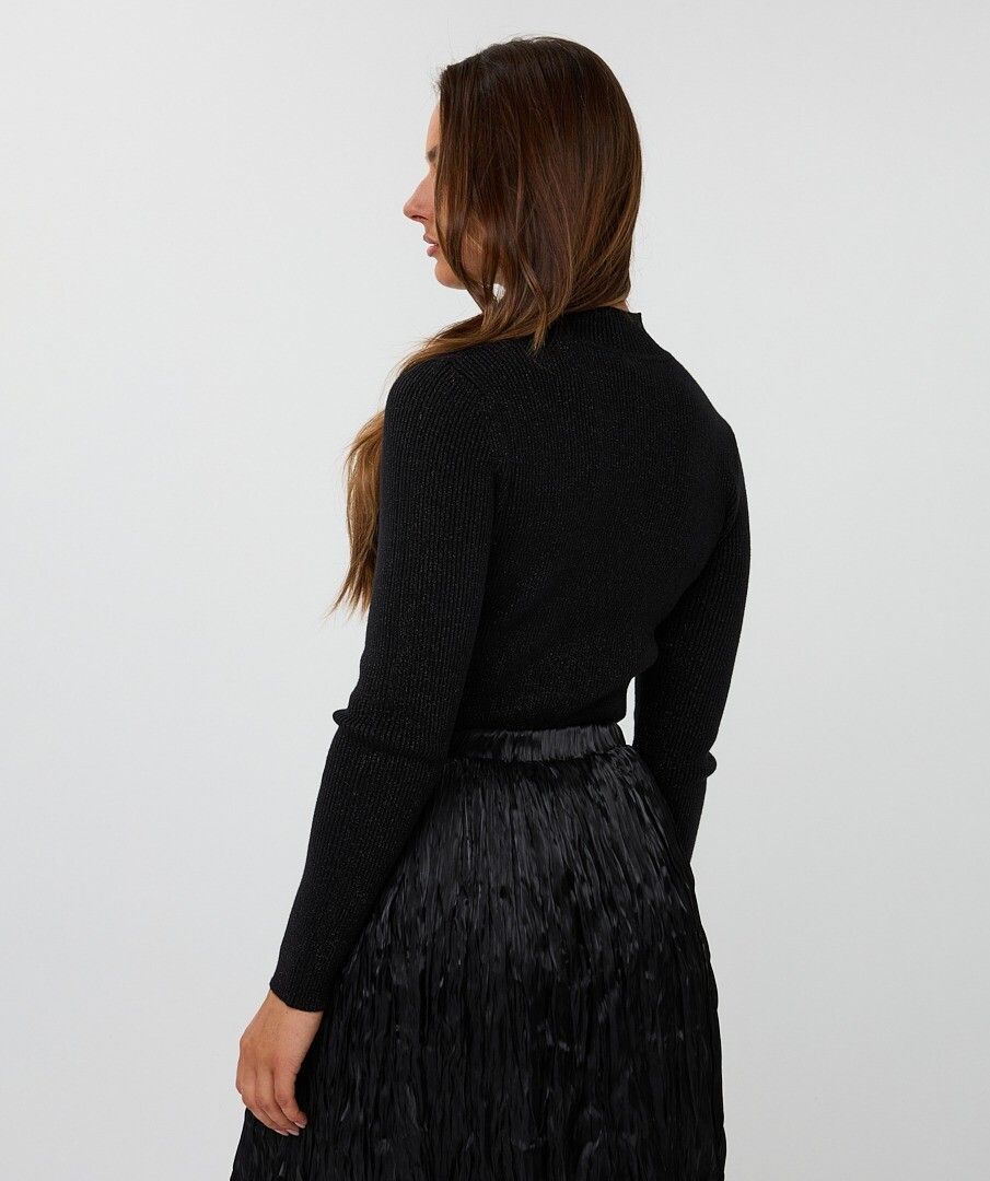 Pull col roulé ajusté en maille fine, orné d'un motif côtelé entrelacé de lurex scintillant. Ce pull est composé de 40 % de viscose, 22 % de polyester, 20 % de lurex et 18 % de nylon. Le mannequin mesure 1,73 m et porte une taille S.
