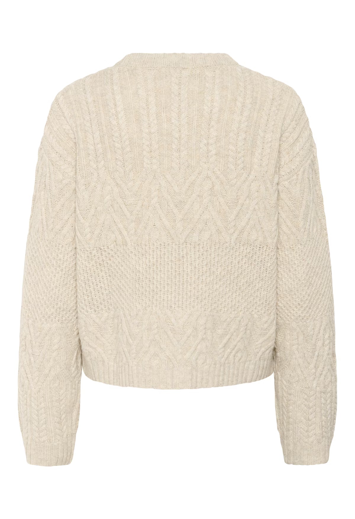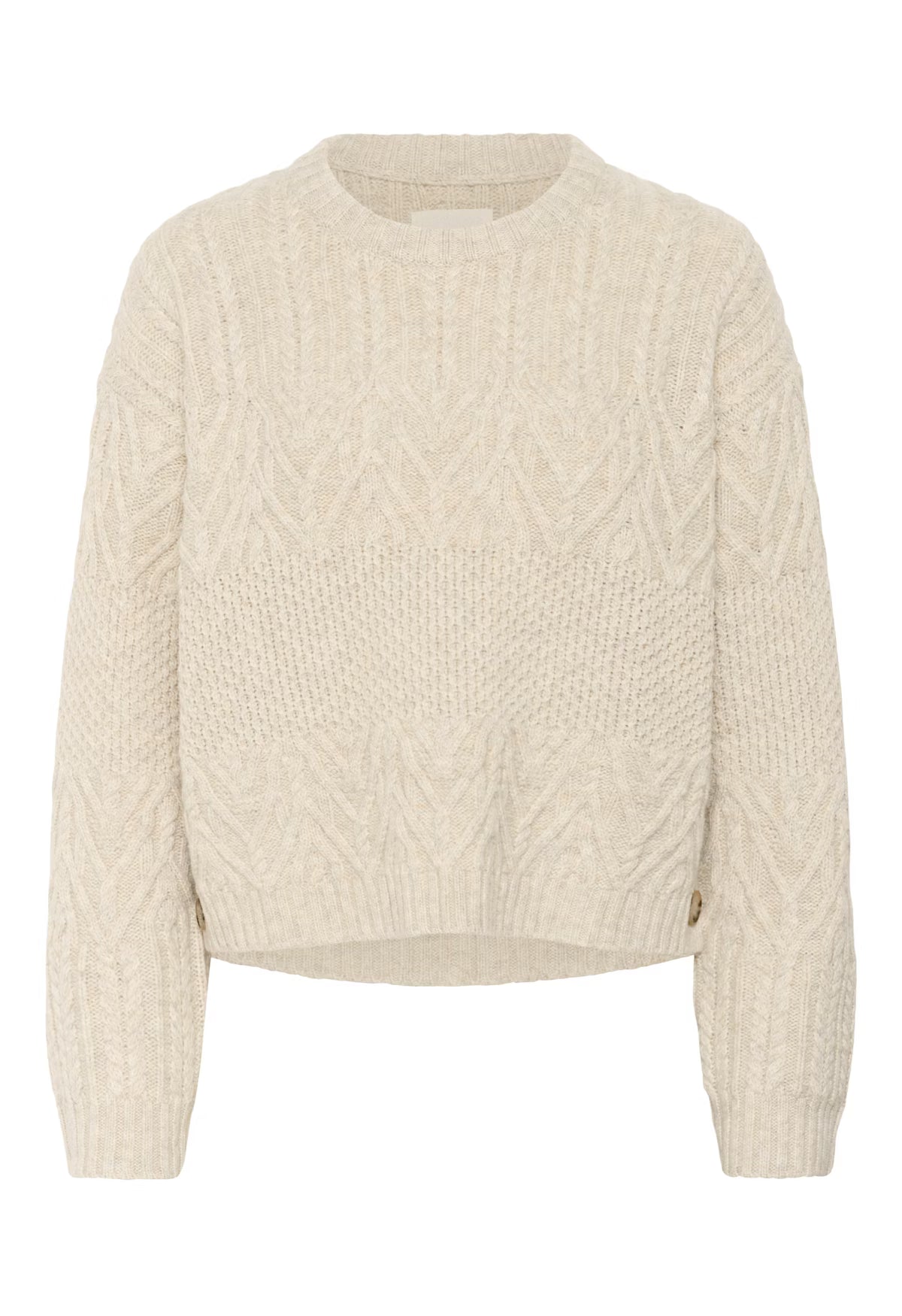 Le mannequin mesure 177 cm et porte une taille M. Ce pull chaud se distingue par sa belle texture et ses boutons décoratifs sur les côtés. Sa maille épaisse et ses motifs variés lui confèrent un aspect artisanal. Portez-le avec un jean ou une jupe en cuir pour une touche de modernité.