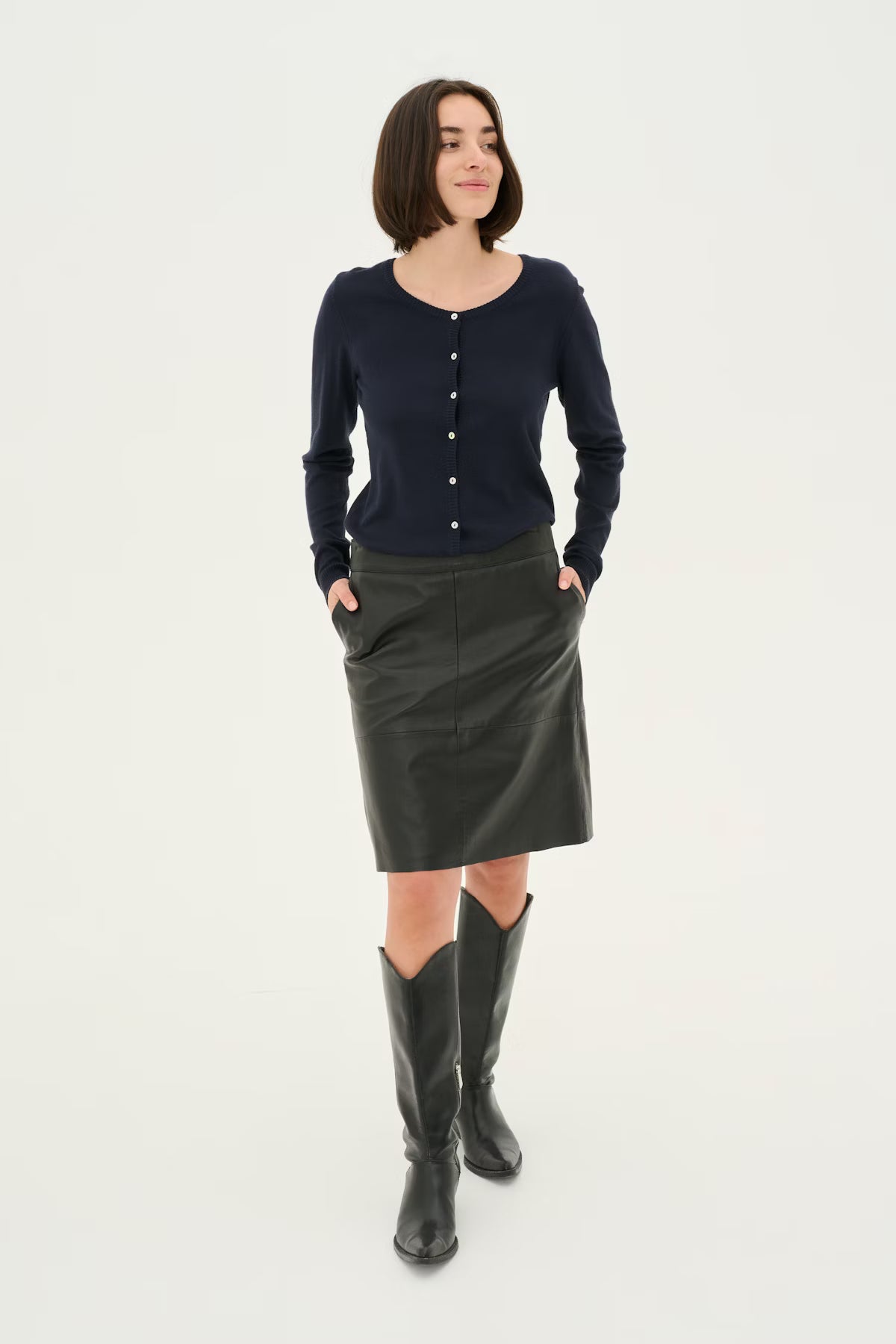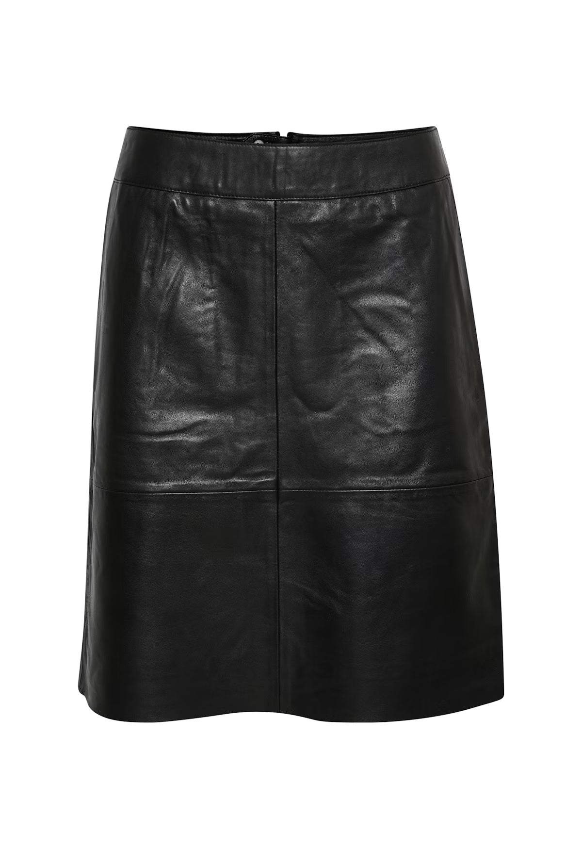 Cette jupe trapèze en cuir présente une coupe mi-longue flatteuse et confortable. Dotée d'une ceinture épurée et de coutures discrètes, elle offre une polyvalence intemporelle pour les occasions décontractées comme formelles.