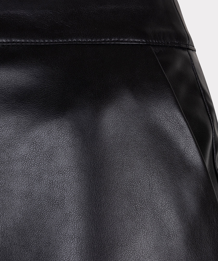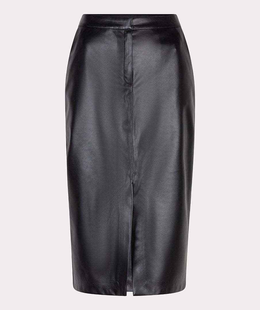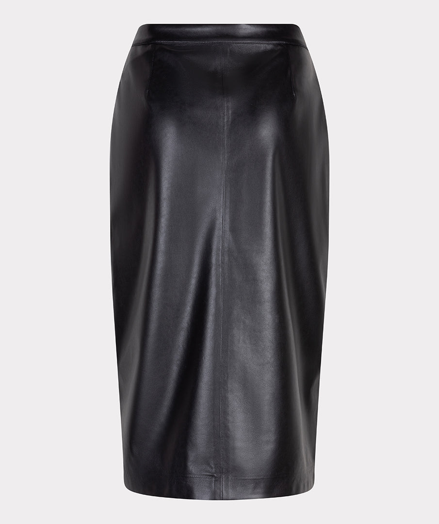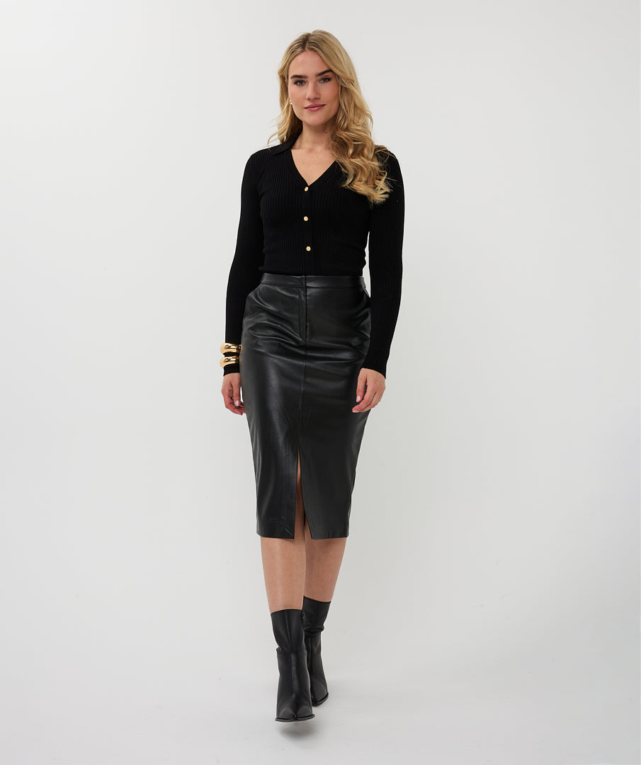Jupe moulante avec fermeture à boutons invisibles, poches latérales et fente devant. Confectionnée en cuir vegan ultra doux et confortable, elle est idéale pour les journées froides. Le mannequin mesure 1,73 m et porte une taille S.