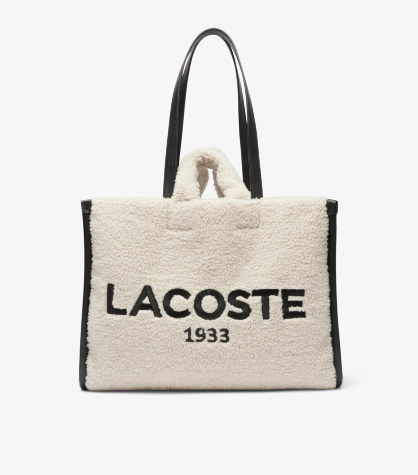Sac de shopping spacieux au style laine signé Lacoste, offrant un design élégant et texturé.