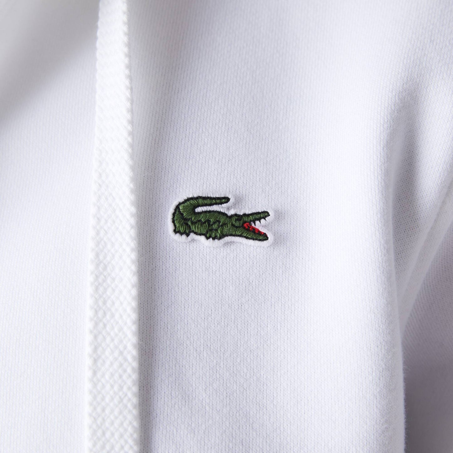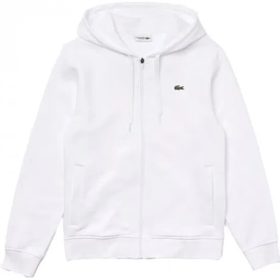 Sweat à capuche Lacoste - Réf. SH1551-800. Couleur : Blanc. Détails. - Col capuche avec cordon de serrage. - Manches longues. - Fermeture zippée. - Poignets et ourlet côtelés. - Deux poches latérales. - Crocodile vert brodé sur la poitrine gauche. Matière : 83% coton, 17% polyester.