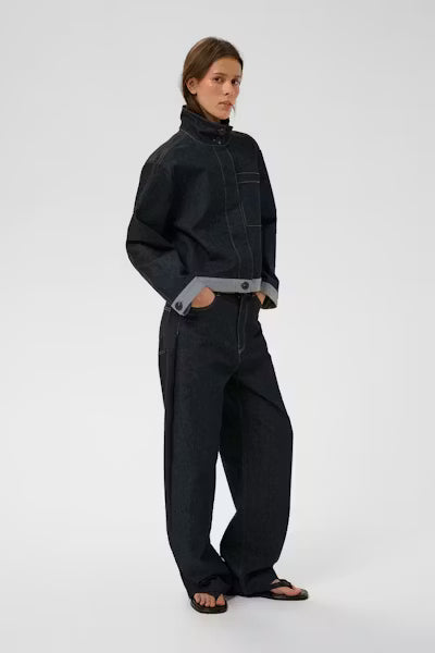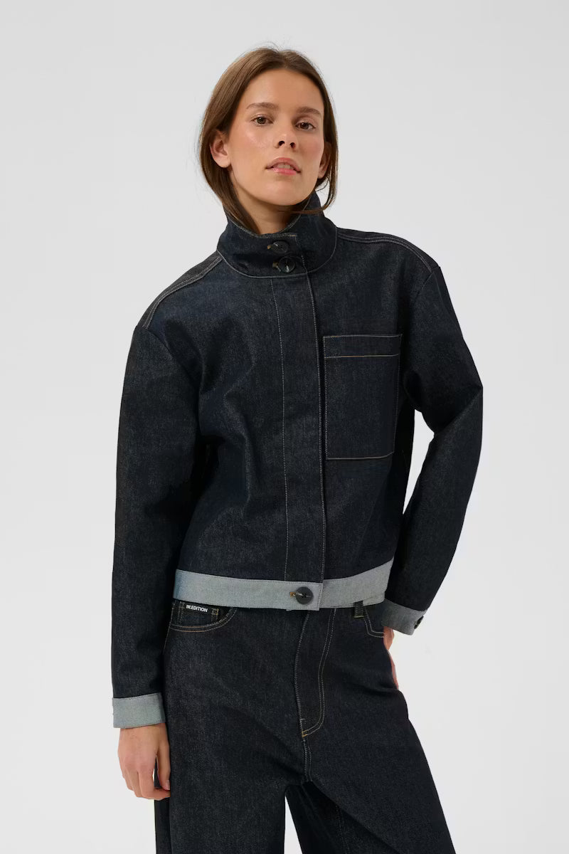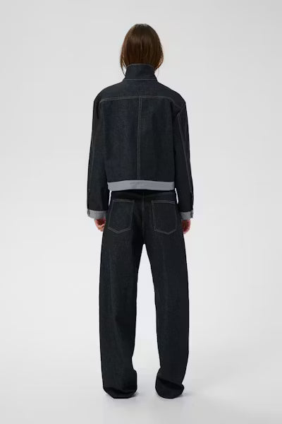 Veste en jean à la coupe structurée, col montant boutonné, empiècement avant original, grande poche poitrine et poignets boutonnés. Silhouette carrée courte avec coutures apparentes contrastantes et ourlet retroussé.