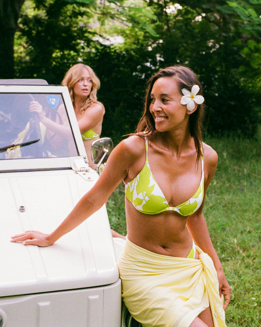 Notre collection Shade présente une silhouette de feuille vert citron éclatante sur un fond blanc éclatant, créant un contraste rafraîchissant. Fabriqué en tissu recyclé, cet imprimé reflète notre engagement pour un avenir plus vert, idéal pour celles qui apprécient à la fois la mode et le développement durable.