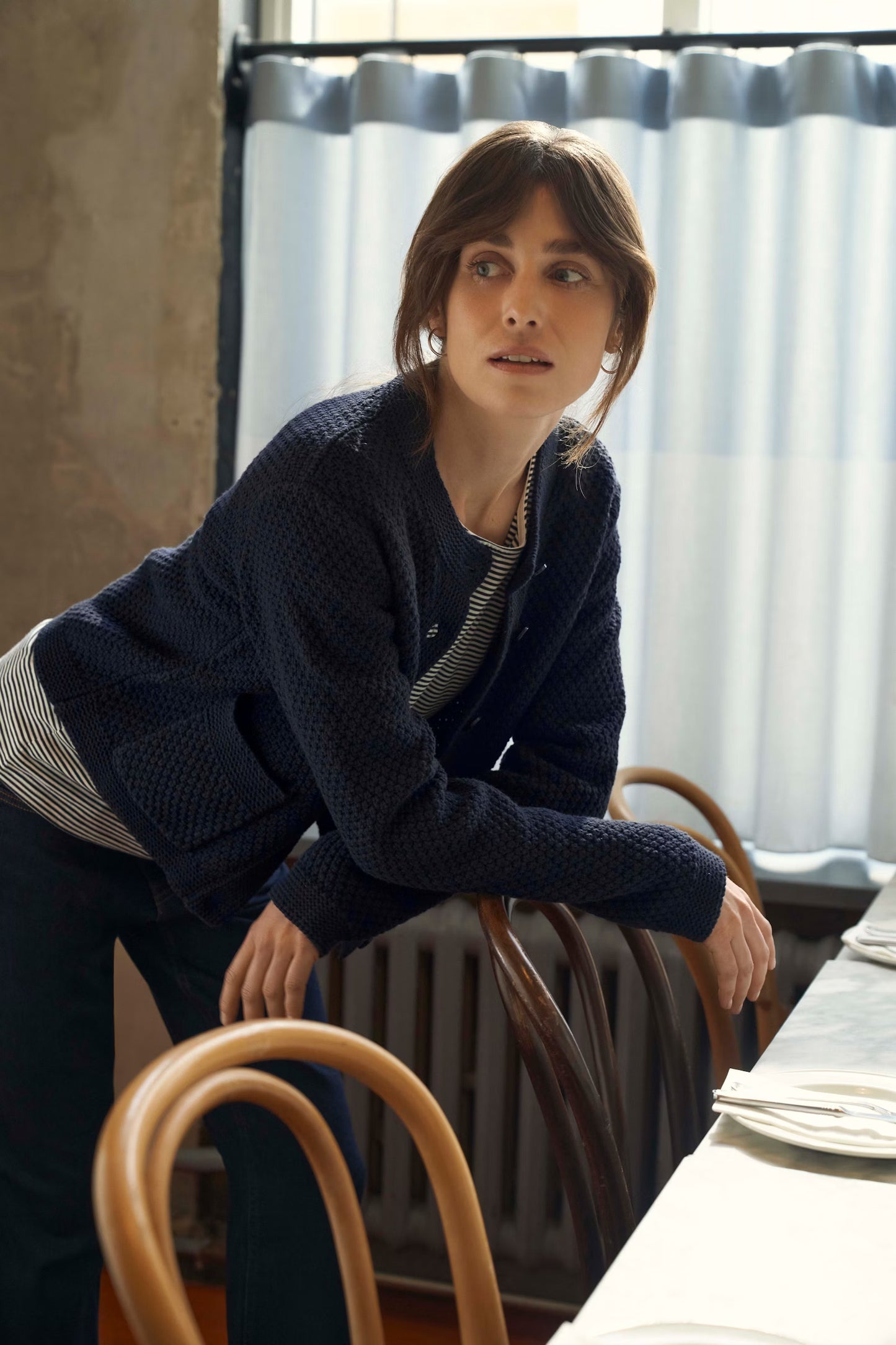 Le mannequin mesure 177 cm et porte une taille M. Ce cardigan rayé est tricoté dans une maille douce et texturée, avec de délicats détails façon crochet dans les rayures foncées. Sa coupe courte et ses poches avant discrètes lui confèrent un look classique et polyvalent. Portez-le ouvert sur une robe ou boutonné avec un jean pour un look décontracté.