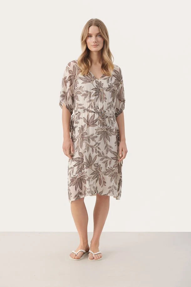 Prix régulier $89.50 CADLa construction aérée et légère offre une coupe décontractée, ce qui rend cette robe parfaite pour les journées chaudes de l'été. La robe est conçue avec des manches courtes drapées et un col en V flatteur, créant ensemble une silhouette féminine et confortable.