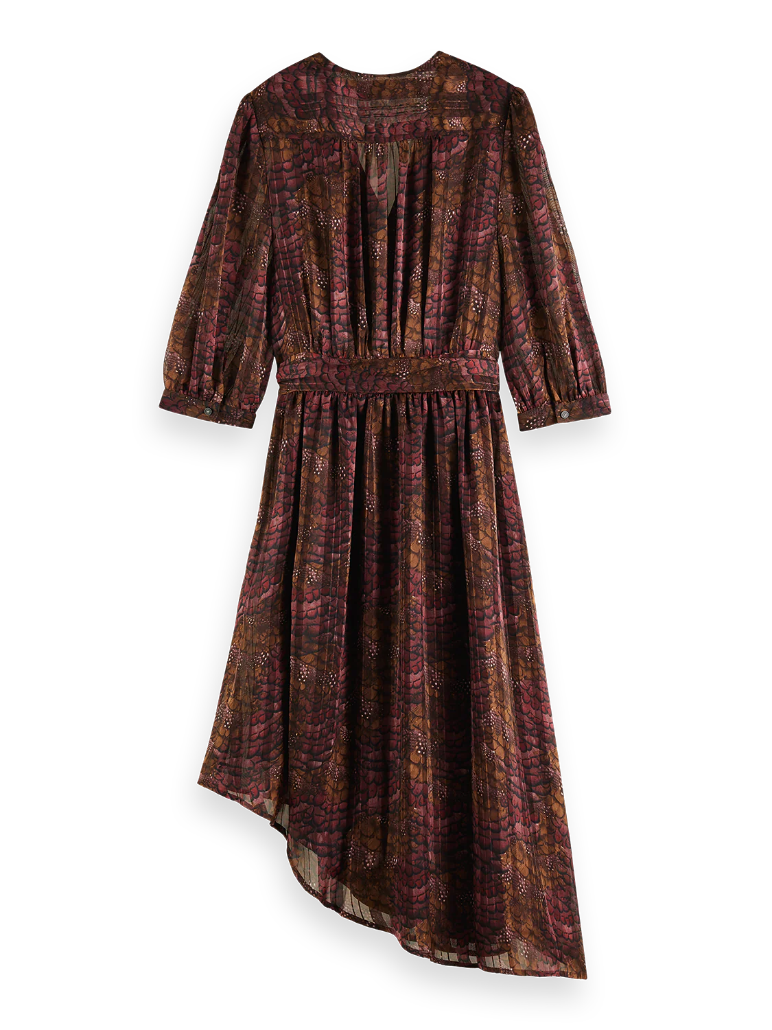 Prix régulier $144.00 CADRobe plissée asymétrique Scotch&Soda avec ceinture à nouer. Longueur midi. Modèle dans une combinaison de couleurs bordeaux et marron.