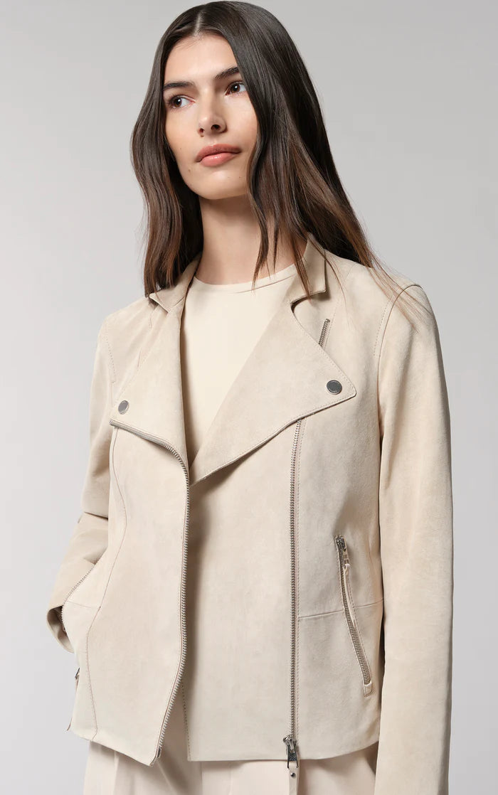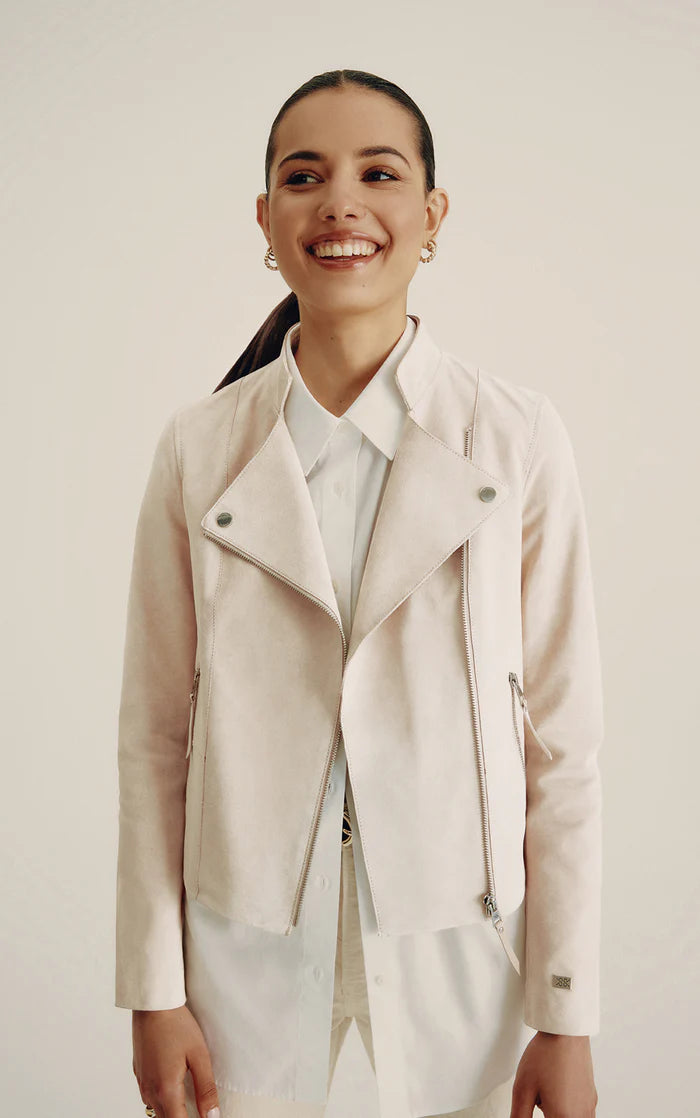 Prix régulier $187.50 CADSASKIA par SOIA & KYO est une veste en suède au look motard qui est conçue pour épouser votre silhouette. Tombant aux hanches, ce modèle classique est rehaussé d’un col montant tendance et de revers crantés ornés de boutons. Les poches inclinées apparentes à fermeture éclair complètent le look.