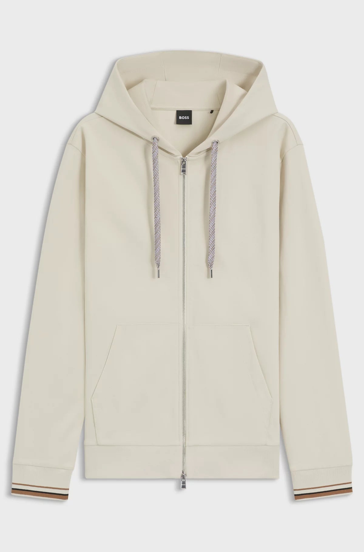 Ce sweat à capuche zippé BOSS Homme, de coupe standard, est un essentiel décontracté. En mélange de coton doux, il est doté de cordons de serrage à motifs et de poignets rayés.