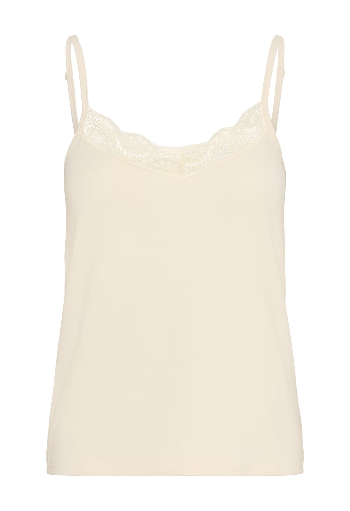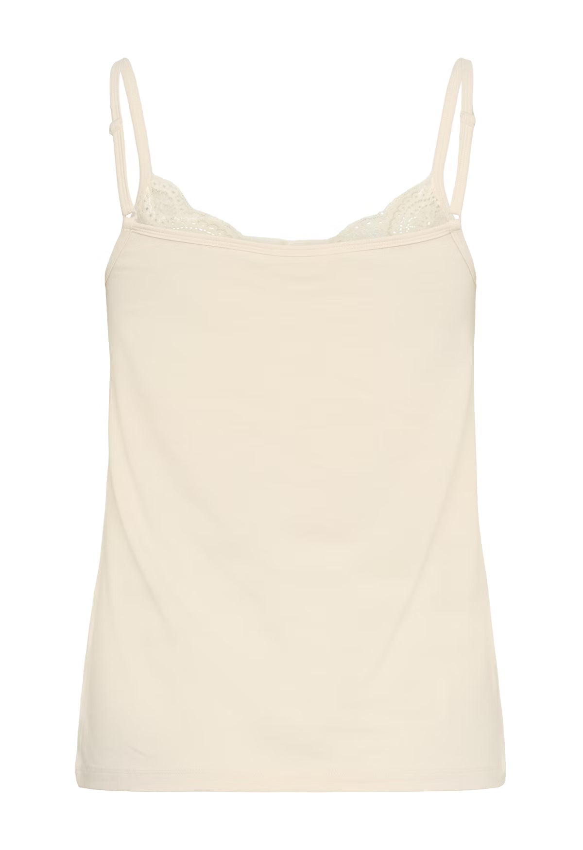 The model is 1.78 m tall and wears a size M. This simple camisole, featuring thin straps and a delicate lace neckline, is a versatile essential. Wear it alone in warmer weather or layered under a shirt, cardigan, or blazer: a feminine touch for any outfit.