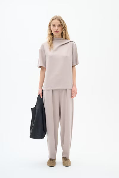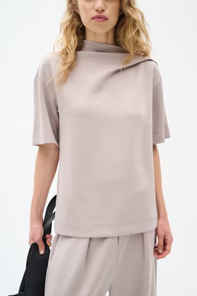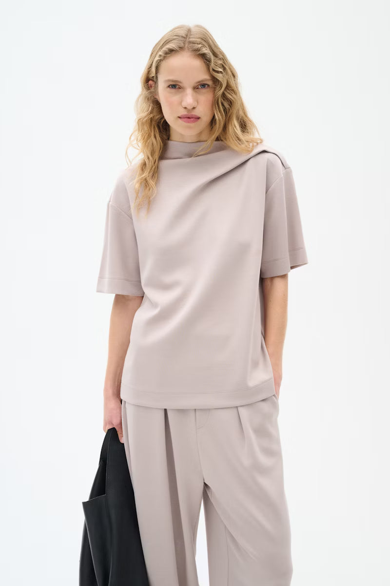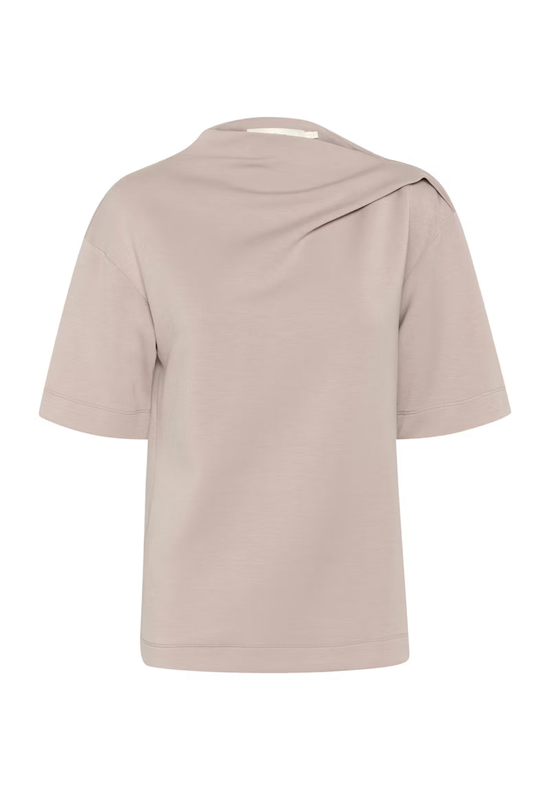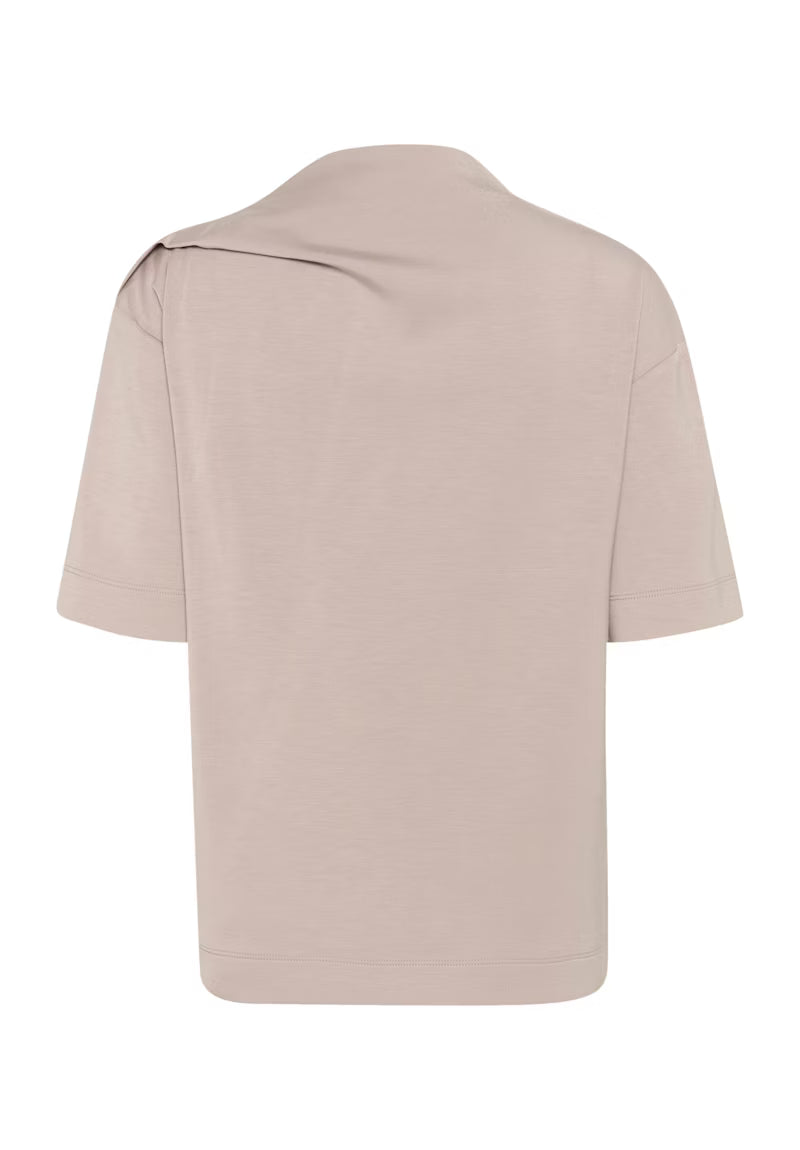 Soft beige short-sleeved T-shirt with a relaxed fit. Its draped neckline adds a modern and elegant touch. Made from a comfortable, stretchy fabric for a relaxed look. The model is 1.76 m tall and wears a size 36/S.