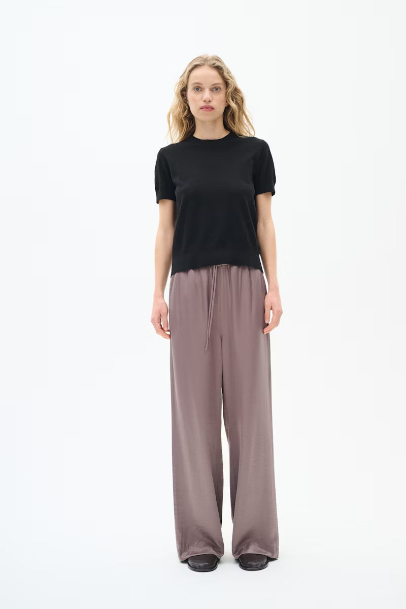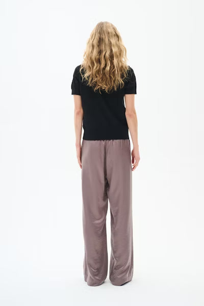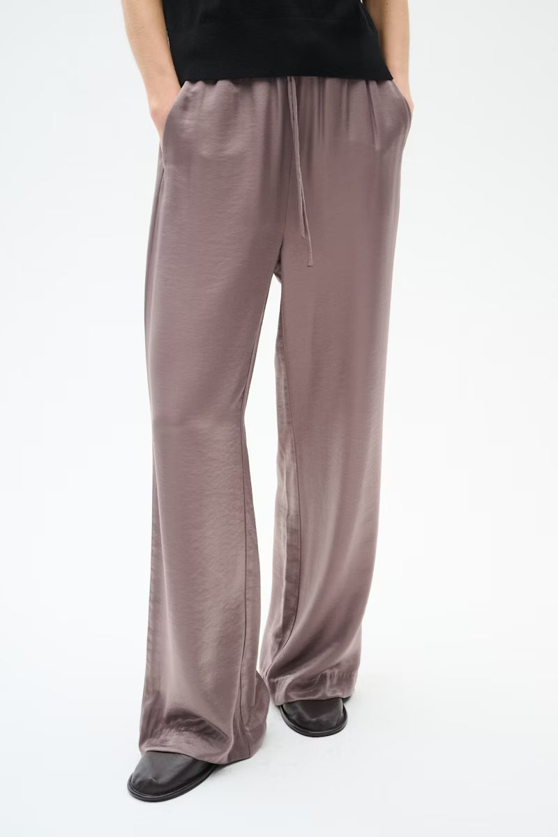 Wide-leg pants in a beautiful brownish-purple shade with a smooth, shiny finish. Made from a lightweight material, they feature an elastic waistband and an adjustable drawstring. The model is 1.76 m tall and wears a size 36/S.