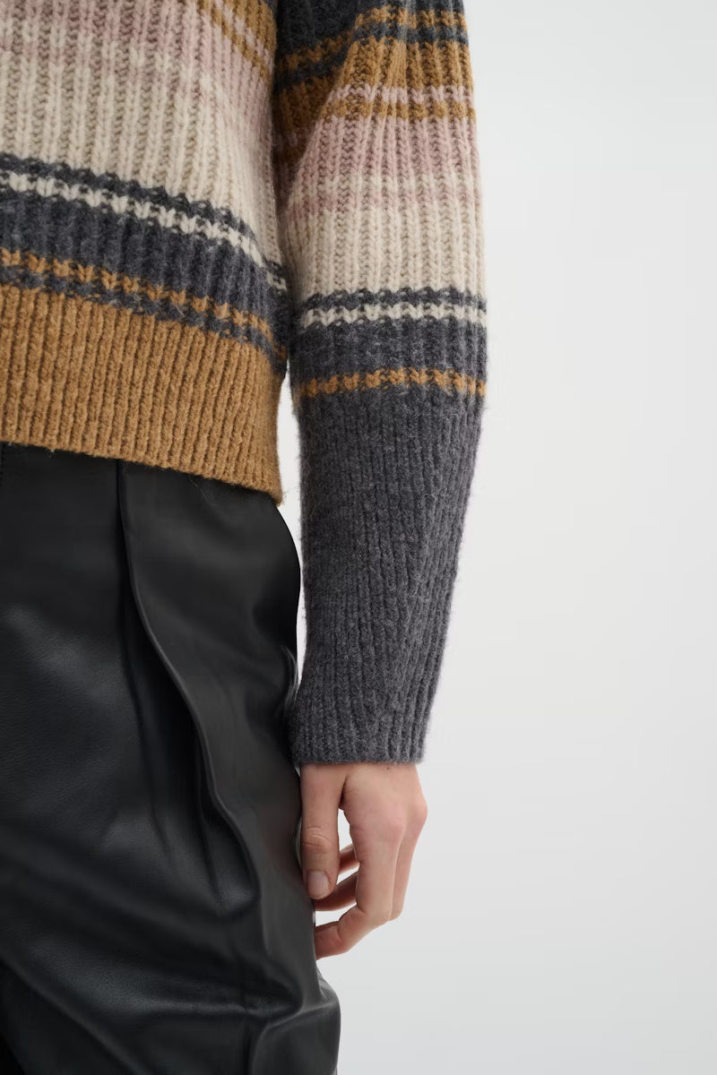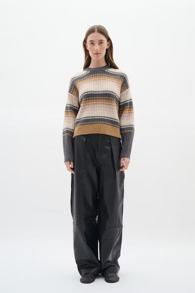 This women's striped ribbed sweater offers a relaxed fit and crew neck, combining timeless style and comfort. Its long sleeves and versatile silhouette make it ideal for both casual and dressy occasions.