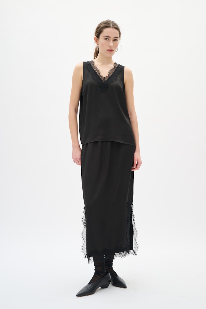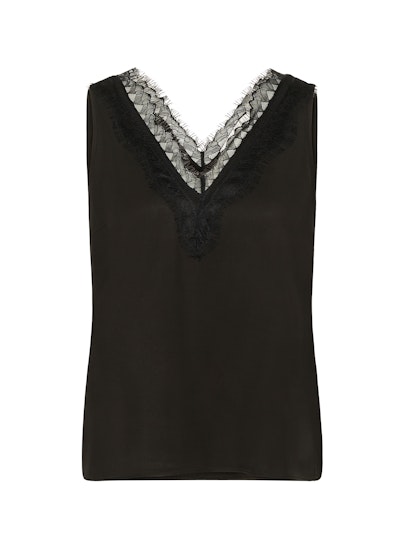 Haut sans manches à la coupe droite et décontractée, doté d'une texture douce et d'une délicate bordure en dentelle frangée le long de l'encolure en V. Sa silhouette épurée et ses subtils détails superposés à l'encolure lui confèrent une élégance naturelle.