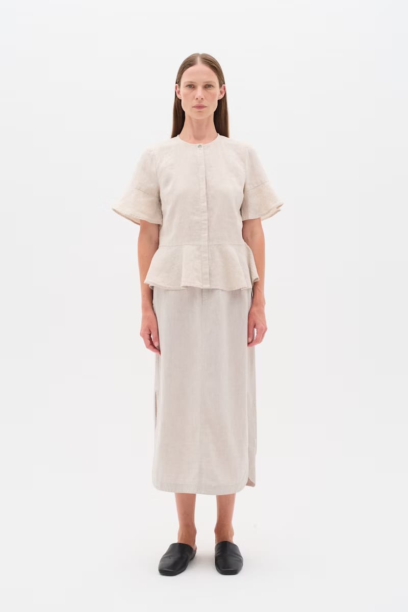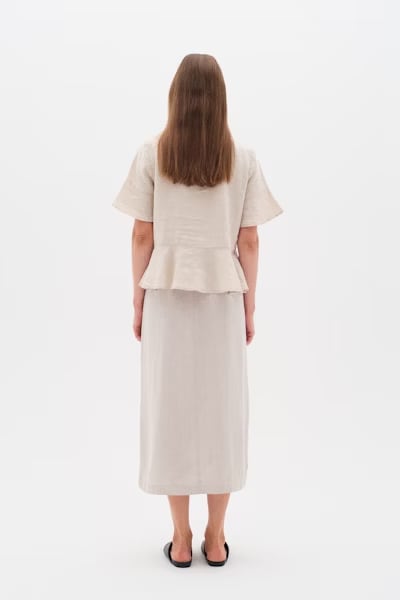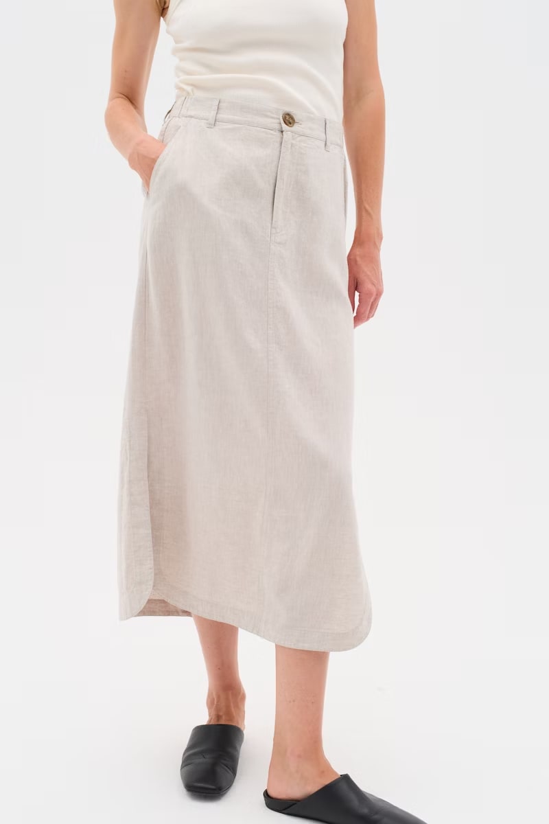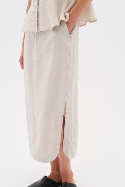 Regular price $79.50 CADLong skirt in a lightweight, sand-beige linen blend. Fixed waist, side pockets, side slit, and button closure. A casual and elegant piece, with timeless charm and everyday comfort. The model is 1.76 m tall and wears a size 36/S.