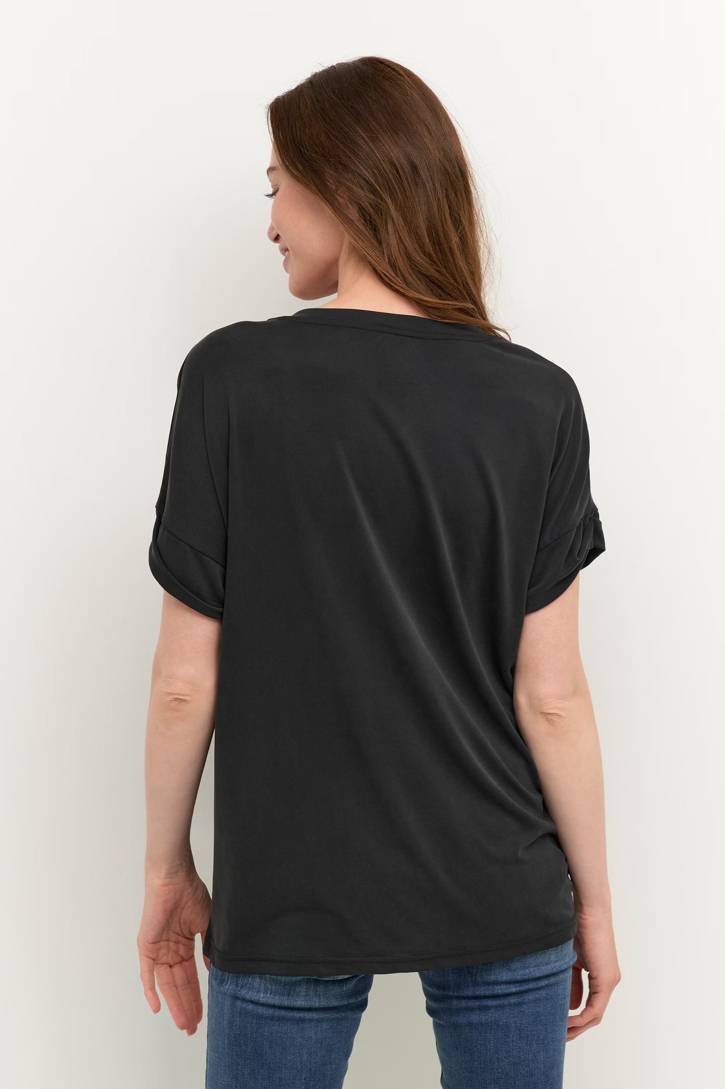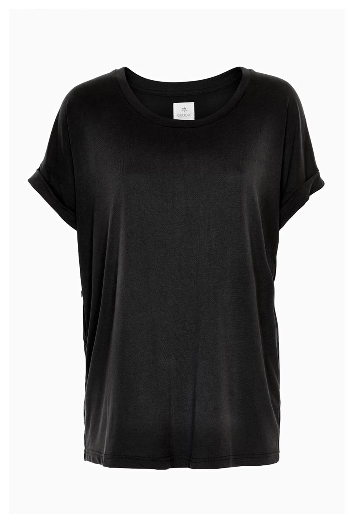 This loose-fitting women's t-shirt features a classic crew neck and short, rolled-up sleeves for a casual, stylish look. Its soft fabric ensures optimal everyday comfort, ideal for versatile styling and everyday use.