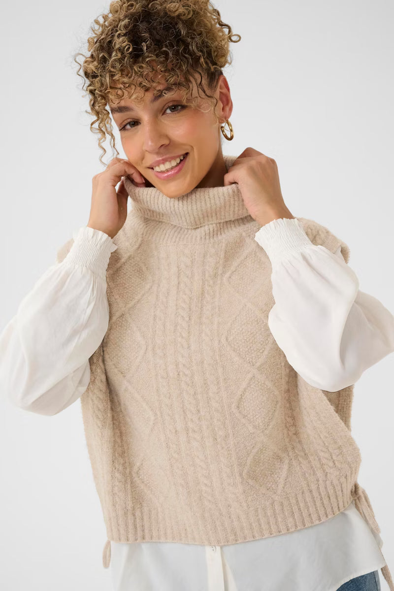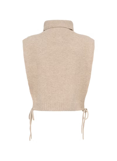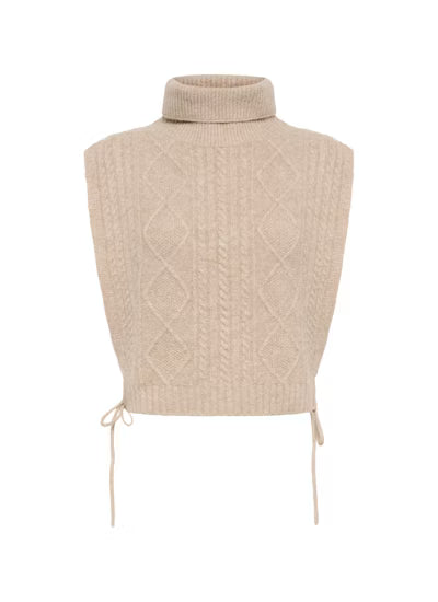 Ce gilet sans manches à col roulé en maille offre une coupe décontractée et arbore des détails en maille torsadée, une encolure haute et des liens réglables sur les côtés. Conçu pour une superposition polyvalente et un confort optimal, il offre une sensation de douceur idéale au quotidien.